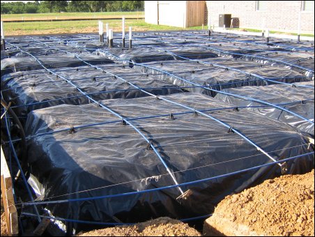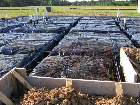 May 19,2008 - Here the trenches for the footings are dug, the vapor barrier is down and the post-tension cables are installed. It's ready for the concrete now.